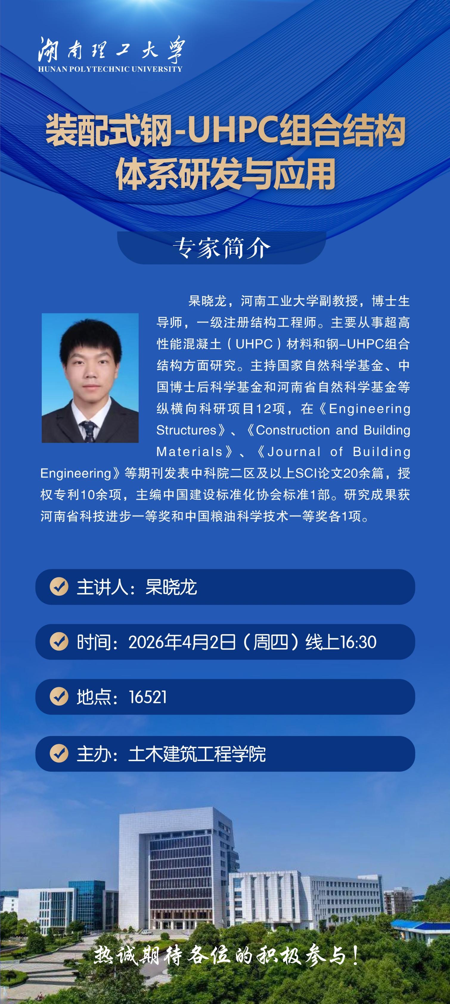 【学术讲座预告】河南工业大学杲晓龙教授“装配式钢-UHPC组合结构体系研发与应用”讲座预告
