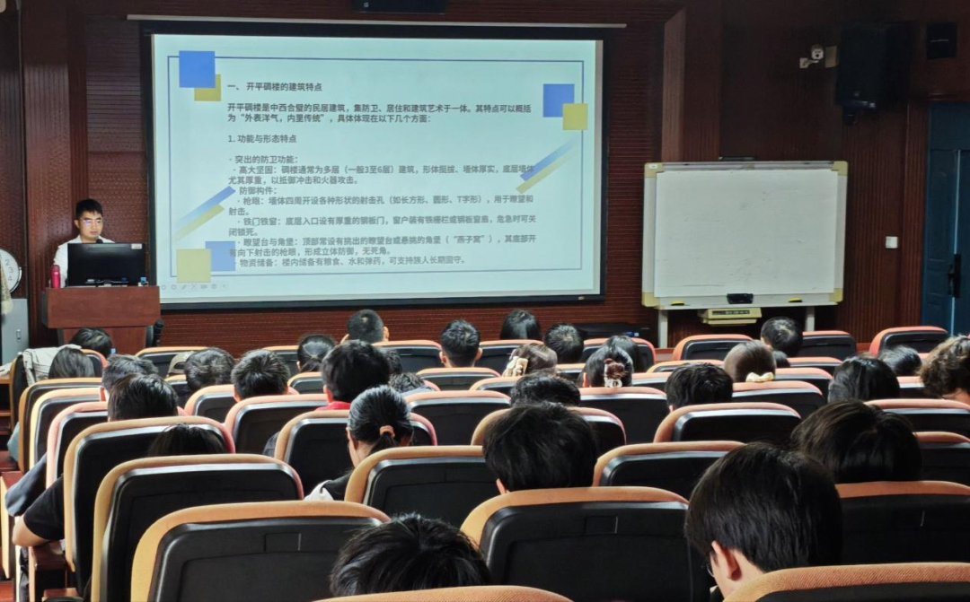 讲座中,方政文结合自身主持的重点修缮项目案例,系统讲解了岭南古建筑的传统营造技艺、文物建筑修缮的核心技术规范,深入剖析了非遗岭南灰塑工艺的传承脉络与创新应用要点,并围绕当前古建保护行业的发展现状、技术难点与人才需求展开分享。他以开平碉楼的保护修缮为例,结合实操过程中的技术细节与文化考量,生动展现了古建筑保护“修旧如旧”原则的实践路径,为同学们呈现了理论知识与工程实践深度融合的专业场景。